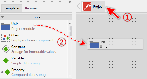 Units provide the space where you can put GUI components and associated bitmap and font resources as well as all other project relevant members. As such, units can exist only at the root level of the project. Unit members are represented in Composer by following bricks: