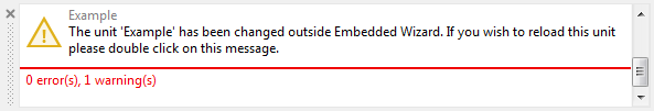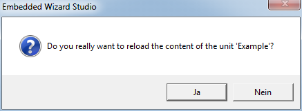 •If you want to load the newer file into Embedded Wizard Studio, double click on the message and confirm the operation in the thereupon displayed message box. With this operation you replace the actual version in Embedded Wizard Studio. Usually, this is the case after you got a newer version of the file from e.g. a version control system: