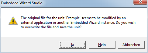 •If you ignore the message, then Embedded Wizard Studio continues to work with the old version. Next time you save the project, Embedded Wizard Studio will ask you whether you really want to replace the externally modified file. If you confirm, the old version in Embedded Wizard Studio overwrites the newer version on the file system. This is typical, if you want to revert an undesirable modification.