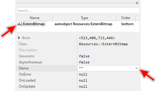 As long as the Extern Bitmap object is selected you can inspect and modify its properties conveniently in the Inspector window as demonstrated with the property Name in the screenshot below: