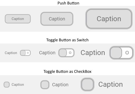 For every widget type we provide three default appearances preconfigured to support the small, medium and large version of the widget. In addition, for some widgets further configurations are available. For example, in case of the Toggle Button you can select between the Switch and the CheckBox version of the widget. The following figure demonstrates it. It shows the Push Button widget and the Toggle Button (as Switch and CheckBox), each in all three possible sizes: