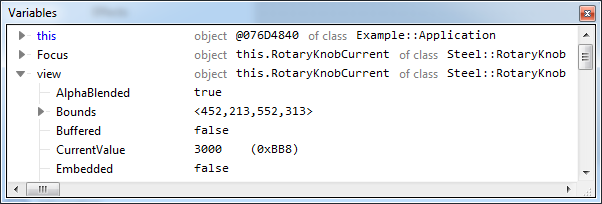 The Variables window appears when the prototyping session is paused. It provides a view of all operands used in context of the current and the immediately preceding statements. As such it is useful to inspect variables and objects while debugging step-by-step the implementation of your GUI components: