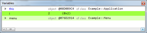 The Variables window detects when during debugging the listed operands are modified and highlights automatically the affected items with green color. This color fades out with time allowing you to simply distinguish which variable has changed recently: