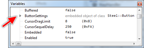 Bitmap and font resources are identified similarly with the additional language variant name, separated by a _ (underscore) sign. For example, the instance of the bitmap resource Steel::PanelBack in its default language variant is shown in the Variables window as follows:
