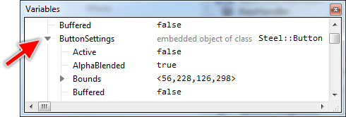 The Variables window displays only the contents stored within the memory associated to the listed operands. This can be confusing when the affected operand is a property implementing its own onget method. When you inspect a property in the Variables window the code of such onget methods is never executed in order to avoid potential interferences with the debugged application.