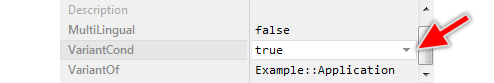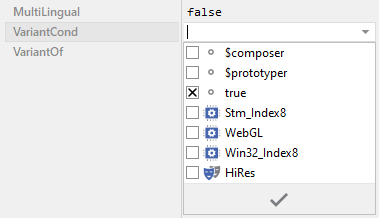 The attribute VariantCond specifies the condition, when a particular class, autoobject, constant, bitmap resource or font resource variant member overrides actively the original member referenced in its corresponding attribute VariantOf. The attribute expects a list of , (comma) separated profile and style names, the built-in macros $composer and $prototyper or the boolean literals true and false. Depending on the operands the condition is fulfilled if: