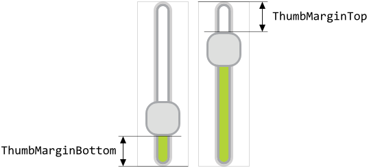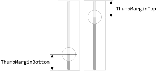 Per default, the thumb can be moved freely across the entire height of the Vertical Slider. If this is not desired, you can specify in the properties ThumbMarginBottom and ThumbMarginTop additional gaps in pixel between the thumb image and the respective bottom or top edge of the slider. The following figure demonstrates the effect of these properties (the gray borders indicate the areas of the respective slider):