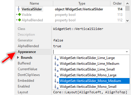 To use the desired appearance configuration you have to select it in the property Appearance of the affected Vertical Slider widget as demonstrated in the screenshot below. You can use the integrated Inspector Assistant window to conveniently select the right configuration. If you like the provided default configurations then you can use them as they are: