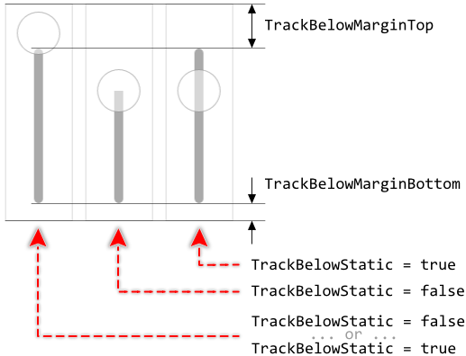 If the Vertical Slider is configured to appear without the thumb image (the property ThumbBitmapDefault, ThumbBitmapActive, ThumbBitmapFocused or ThumbBitmapDisabled is null), the specified margins are still valid. The properties ThumbMarginBottom and ThumbMarginTop determine in this case the minimal distances between the position where the both tracks join together (the expected center position of the thumb) and the respective bottom or top edges of the widget. In other words, by using the properties you can specify the minimum height for the corresponding lower and upper tracks: