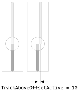 Unless it was explicitly configured, the center of the thumb and the position where the both tracks join together do match. In other words, the thumb appears horizontally centered at the tracks join position. By using the properties ThumbOffsetDefault, ThumbOffsetActive, ThumbOffsetFocused and ThumbOffsetDisabled an additional displacement for the thumb can be configured. The resulting thumb position can thus depend on the current state of the widget. For example, in the Active state the Thumb views may appear slightly shifted resulting in the visual effect as if the thumb were pressed: