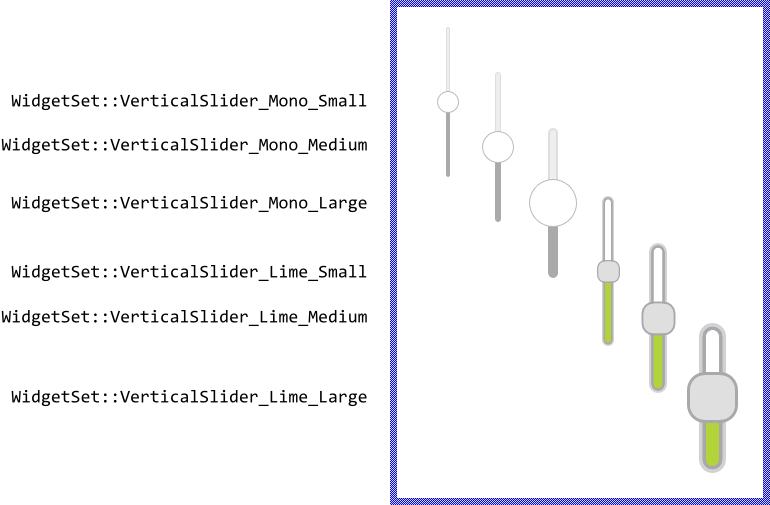 The following sections are intended to provide you an introduction and useful tips of how to work with and how to customize the Vertical Sliders. For the complete reference please see the documentation of the WidgetSet::VerticalSlider and WidgetSet::VerticalSliderConfig classes.