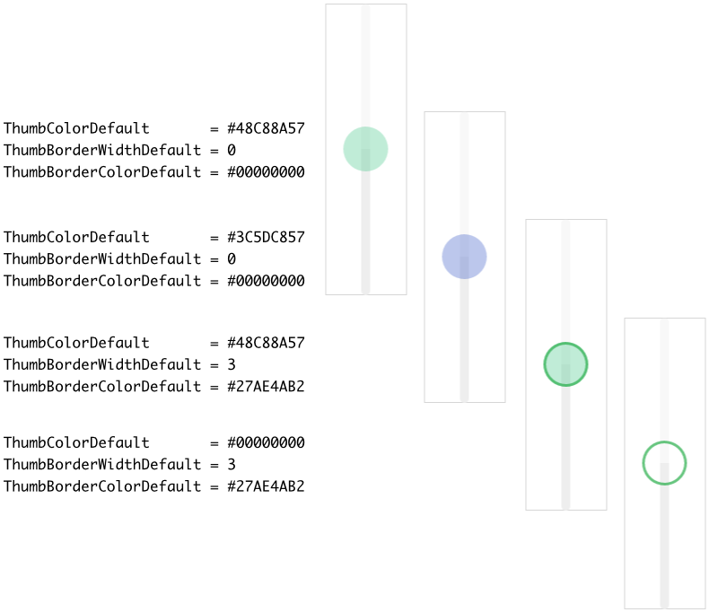 These properties determine the color to stroke the border surrounding the thumb when the slider is in the corresponding state. To see the border ensure that the properties from the list above configure the border thickness greater than 0. |