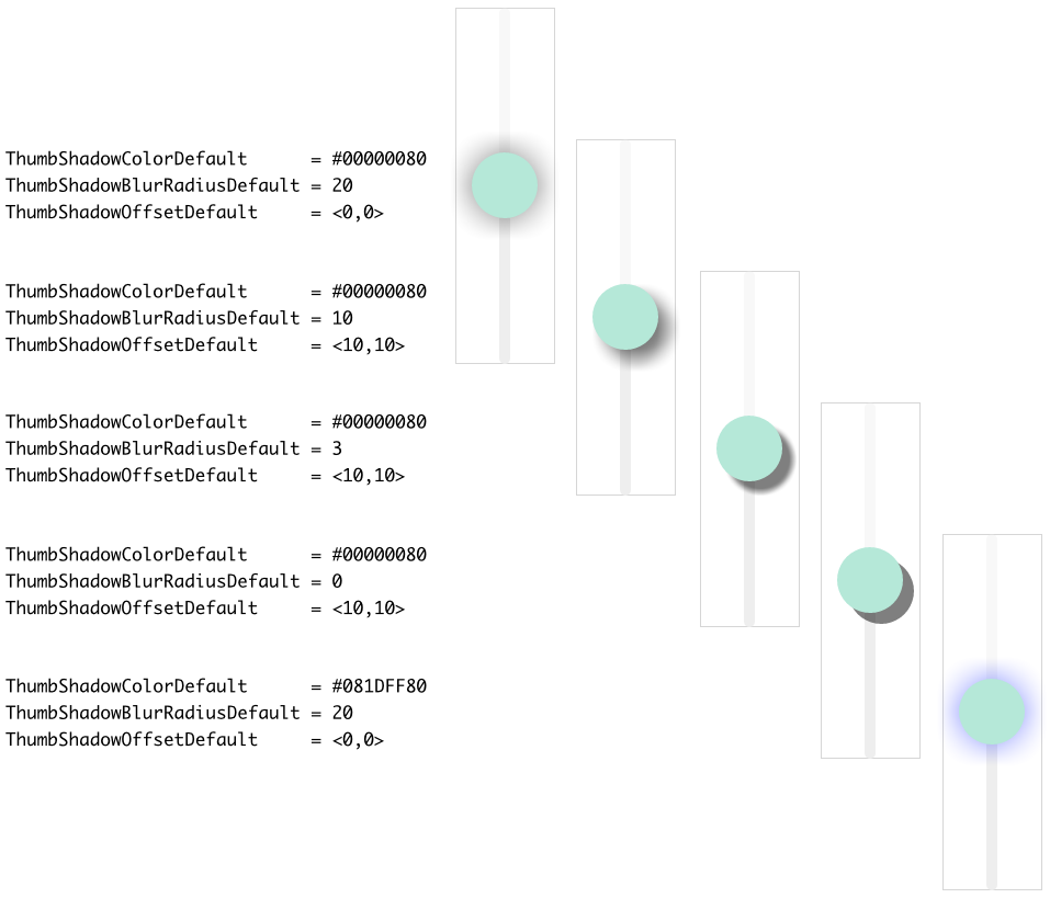 These properties determine the blur radius of the shadow behind the thumb when the slider is in the corresponding state. The greater the value the more blurred the resulting shadow. |