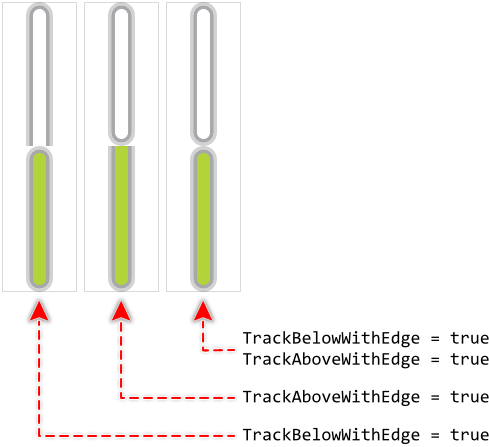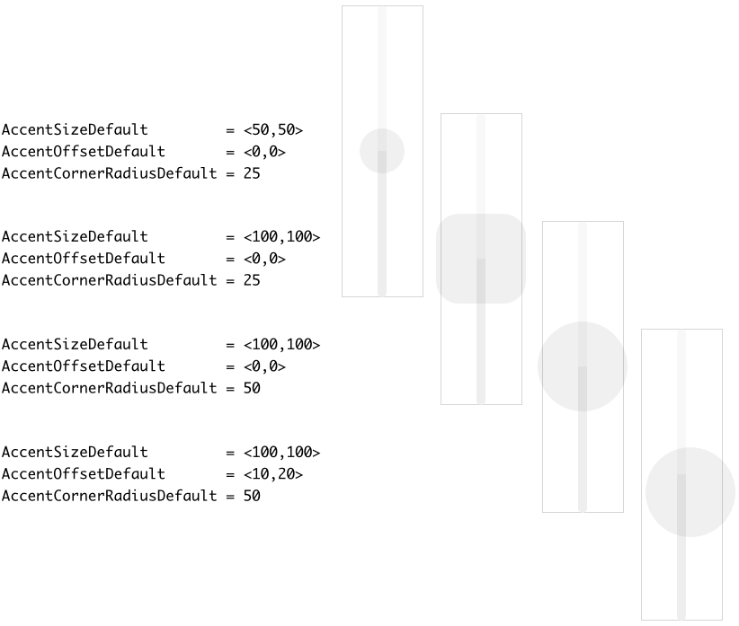 The following figure demonstrates the effect of diverse property combinations. The gray thin borders indicate the areas of the resulting Vertical Slider. For demonstration purpose the accent is configured to appear with rounded corners: