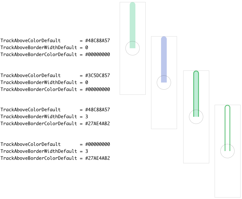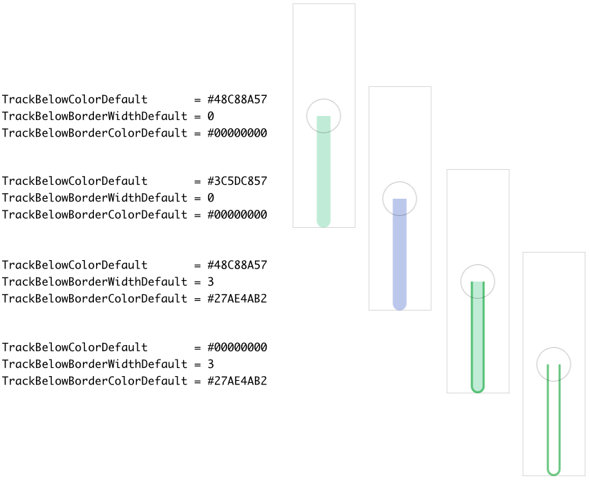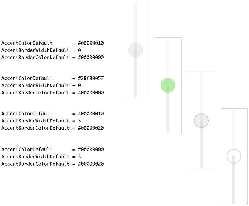 These properties determine the color to stroke the border surrounding the accent when the slider is in the corresponding state. To see the border ensure that the properties from the list above configure the border thickness greater than 0. |
