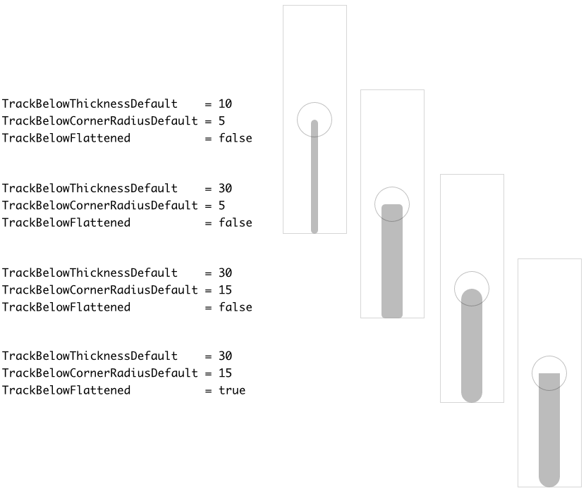 The following figure demonstrates the effect of diverse property combinations. The gray thin borders indicate the areas of the resulting Vertical Slider. For demonstration purpose the thumb is configured to appear with rounded corners: