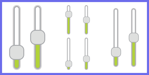 The following figure demonstrates the effect of diverse property combinations. The gray thin borders indicate the areas of the resulting Vertical Slider. For demonstration purpose the thumb views are configured to appear with rounded corners: