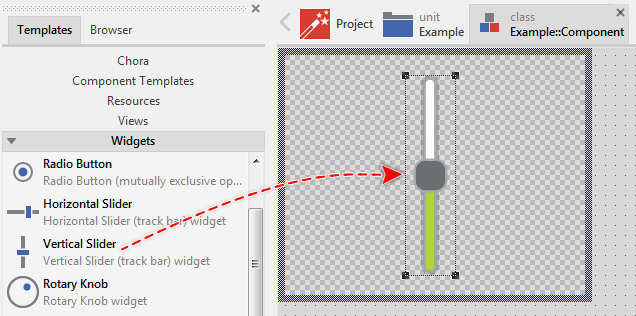 To add a new Vertical Slider widget just at the design time of a GUI component do following: