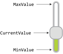 The possible value range for the property CurrentValue is determined by the both properties MinValue and MaxValue, whereby the value specified in the property MinValue corresponds to the lowermost position of the thumb and the value of the property MaxValue to the uppermost position. Thus, the value of the property CurrentValue lies always between MinValue and MaxValue. When the user drags on the thumb, the new value is interpolated within this range. The following figure demonstrates the relations between the three properties: