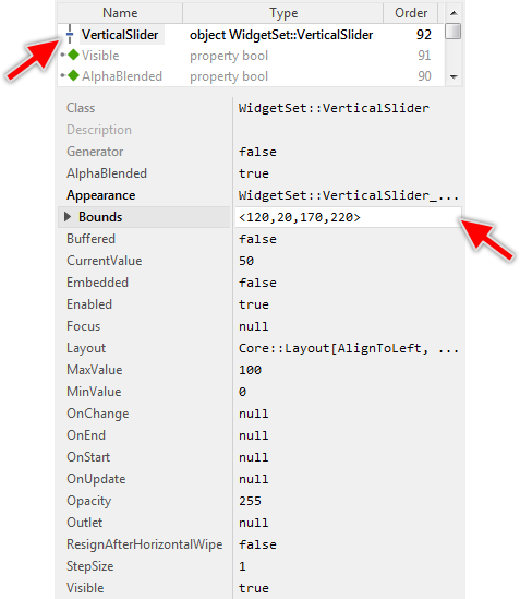 As long as the Vertical Slider widget is selected you can inspect and modify its properties conveniently in the Inspector window as demonstrated with the property Bounds in the screenshot below: