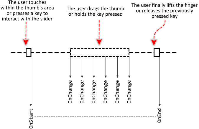 The following sequence diagram demonstrates a typical order in which the slot methods receive signals while the user interacts with the Vertical Slider. Please note, that every interaction starts with a signal sent to the OnStart and ends with a signal sent to the OnEnd slot method. In between, the widget will send signals to OnChange slot method, every time the user drags the thumb: