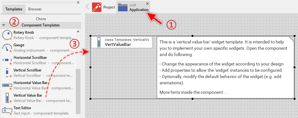 The approach with component templates has two functions. Primarily the templates should simplify the development of new components. Instead of creating the Vertical Value Bar from scratch you can use the available template. The second function is more educative. The template implements fully working value bar component you can investigate and learn about the corresponding programming aspects. The template is well documented. It contains annotations and inline comments with instructions helping you to understand how the component works and how it can be adapted to your particular needs.