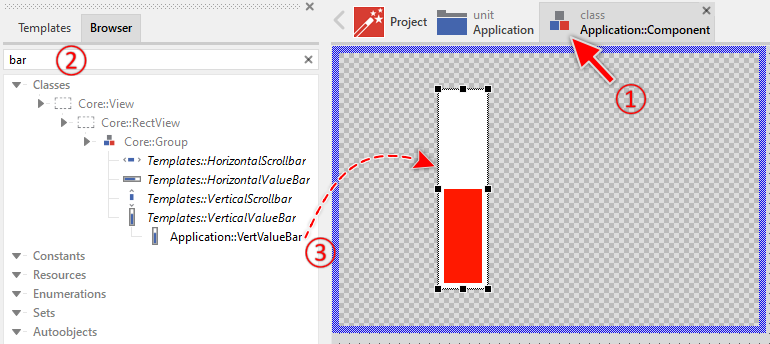 To create a new Vertical Value Bar component from a template you simply Drag & Drop it between the Templates window and the Composer with an opened unit. This is important in that by using the component templates you add in fact a new class to your project. Classes, in turn, can exist within units only. The following are the typical steps to create a new Vertical Value Bar component from a template: