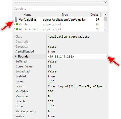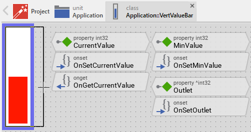 Summarized, after assigning a reference to an existing int32 property to the Vertical Value Bar's own property Outlet, the widget adapts its own state to automatically correspond to the actual value of the associated property. You don't need to write a single line of code to benefit from this mechanisms. The aspects underlying this technique are explained in the sections Outlet properties and Notifications and Observer.