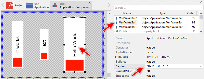 That is all. Now when you deal with instances of the Vertical Value Bar component, you can evaluate and modify the properties similarly to how you access variables. Especially, when an instance is selected, you see in Inspector window the property and can change it there. The modification is immediately visible in the Composer window: