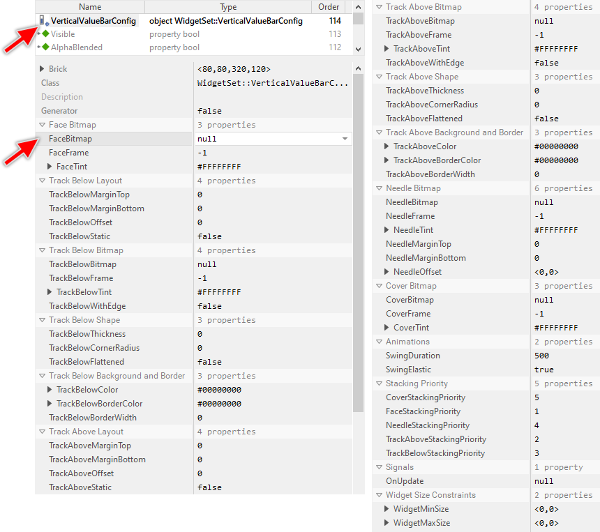 As long as the Vertical Value Bar Config object is selected you can inspect and modify its properties conveniently in the Inspector window as demonstrated with the property FaceBitmap in the screenshot below. Please note, for better overview the below screenshot has been made with Inspector window being configured to sort the properties by categories: