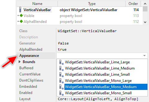 To use the desired appearance configuration you have to select it in the property Appearance of the affected Vertical Value Bar widget as demonstrated in the screenshot below. You can use the integrated Inspector Assistant window to conveniently select the right configuration. If you like the provided default configurations then you can use them as they are: