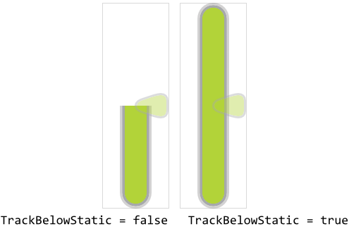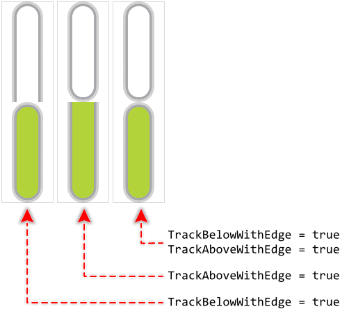 This truncation is not always desired. Depending on the design of your individual value bar, it can be necessary to always display the whole track inclusive its both end caps. This can be controlled by modifying the properties TrackBelowWithEdge and TrackAboveWithEdge. If you assign the value true to the property TrackBelowWithEdge, the lower track is not truncated anymore. It appears with its all edges. Similarly, if you initialize TrackAboveWithEdge with true, the upper track is not truncated. You can also combine both. The following figure demonstrates the effect of these properties: