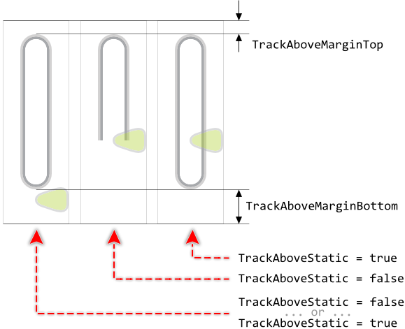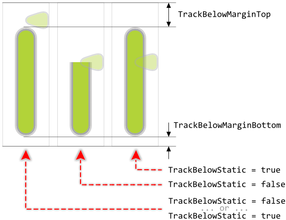 Further properties TrackBelowMarginTop and TrackBelowMarginBottom are useful to determine the minimal distances in pixel between the top/bottom edges of the Value Bar and the corresponding ends of the track. The so configured margins limit the range in which the track's height may change. Once the margin is reached, the track stops growing. This is also true for tracks configured to have fixed height (property TrackBelowStatic). In such case, the static track will fill the area between the margins. The following figure demonstrates the effect of the margins (the gray borders indicate the areas of the respective widget):