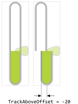 Starting with version 13, the Vertical Value Bar enhances its visual element TrackAbove by a rectangle and border views. Those new views display the track using scalable vector graphic so that the Vertical Value Bar is not restricted anymore to use bitmap resources only. To configure the area and the shape of the new views, following properties are available: