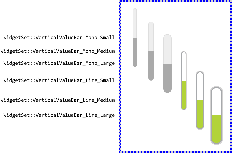 The exact appearance and behavior of the Vertical Value Bar is determined by a Vertical Value Bar Config object. This configuration object provides bitmaps, colors and other configuration parameters needed to construct and display the affected Vertical Value Bar. Embedded Wizard is delivered with a set of prepared Vertical Value Bar Config objects you can use instantly as they are. However, if desired, you can create your own configuration objects and so customize the Vertical Value Bar widgets according to your particular design expectations. The following screenshot demonstrates few examples of how Vertical Value Bars appear in the canvas area of Composer (and accordingly on the screen in your target device):