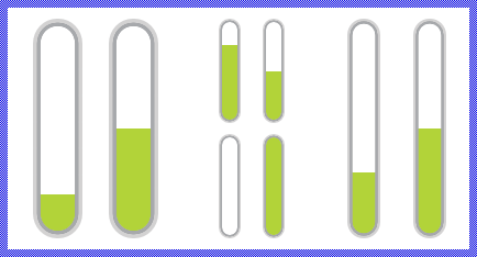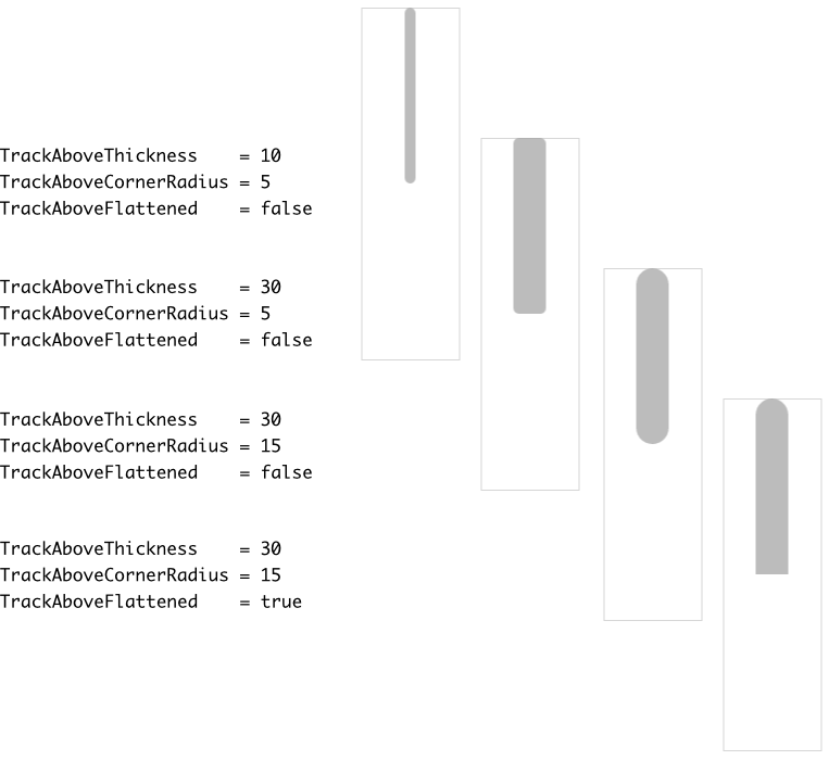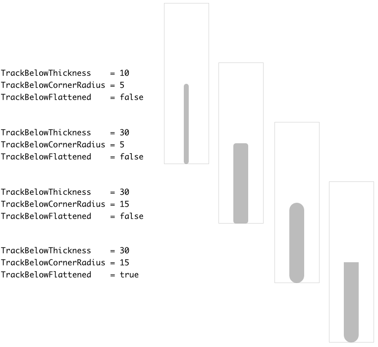 The following figure demonstrates the effect of diverse property combinations. The gray thin borders indicate the areas of the resulting Vertical Value Bar. For demonstration purpose the track views are configured to appear with rounded corners: