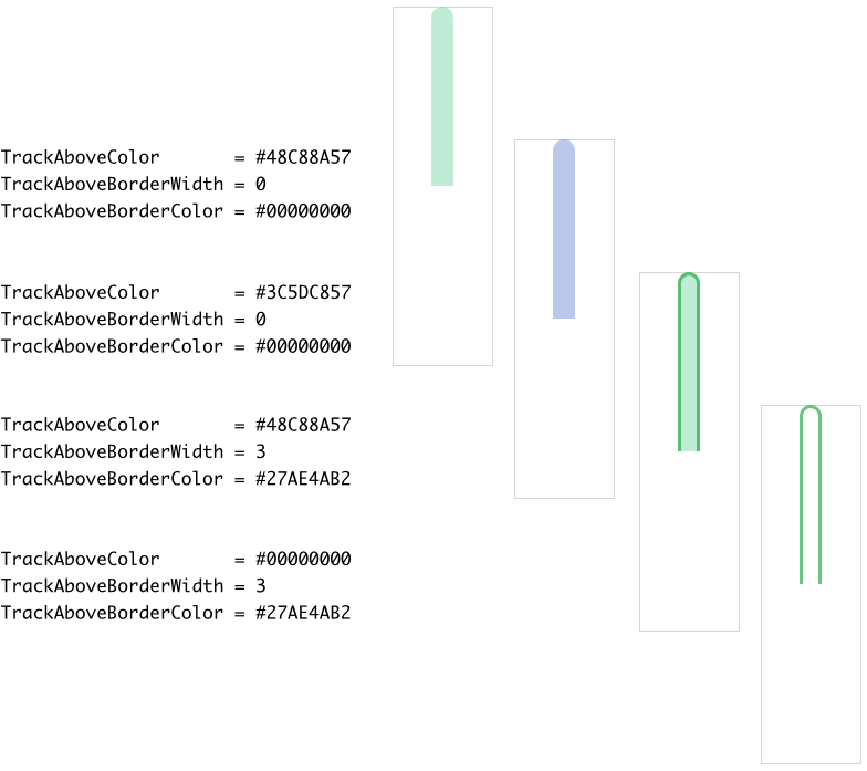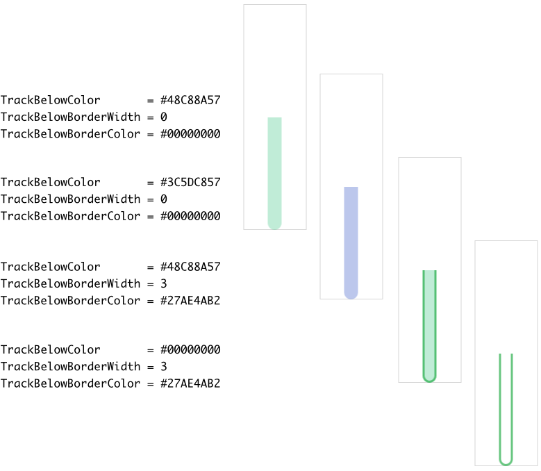 Starting with version 13, the Vertical Value Bar enhances its visual element TrackBelow by a rectangle and border views. Those new views display the track using scalable vector graphic so that the Vertical Value Bar is not restricted anymore to use bitmap resources only. As described in the section above the shape of the new track views can be configured. With following properties you configure the colors to fill the background of the track and to stroke its borders: