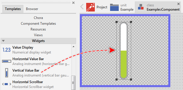 To add a new Vertical Value Bar widget just at the design time of a GUI component do following: