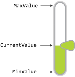 The possible value range for the property CurrentValue is determined by the both properties MinValue and MaxValue, whereby the value specified in the property MinValue corresponds to the lowermost position of the needle and the value of the property MaxValue to the uppermost position. Thus, the value of the property CurrentValue lies always between MinValue and MaxValue. The following figure demonstrates the relations between the three properties: