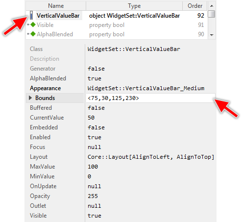 As long as the Vertical Value Bar widget is selected you can inspect and modify its properties conveniently in the Inspector window as demonstrated with the property Bounds in the screenshot below: