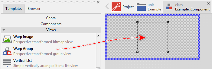 The Warp Group view is ideal to perform fancy animations and transitions with the image of the original component. For example, you can implement an application which fades-in the image of an embedded component by scaling and rotating it dynamically from the center of the screen. Once the image has reached the size and the angle of the original component, the Warp Group view disappears and the original component becomes visible. From the users perspective, the component was visible all the time. The following steps describe how such application case can be done: