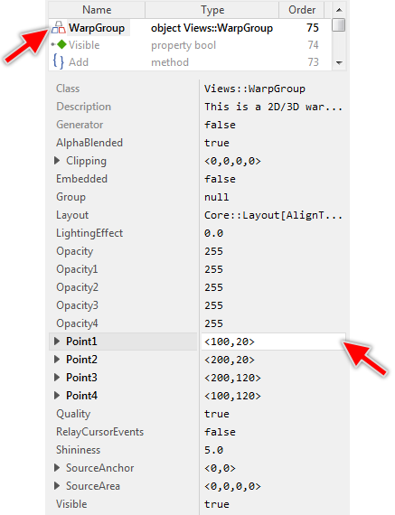 As long as the Warp Group view is selected you can inspect and modify its properties conveniently in the Inspector window as demonstrated with the property Point1 in the screenshot below: