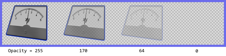 Using the property Opacity you can modulate the original opacity of the displayed component image, so that it appears semi-transparent even if the original content was opaque. The valid values for the property Opacity are 0 .. 255, whereby the smaller the value the more transparent the resulting image. For example: