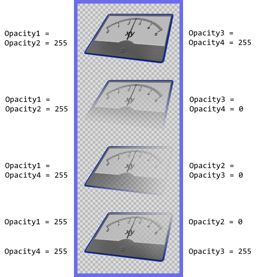 Alternatively you can specify for every corner (Point1, Point2, Point3, Point4) an individual opacity value resulting in the component image being modulated by an opacity gradient. For this purpose modify the corresponding properties Opacity1, Opacity2, Opacity3 and Opacity4. For example: