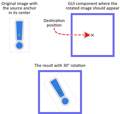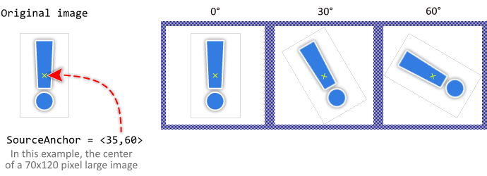Before you use this method, you should understand the concept of the anchor position. It determines the pixel within the image around which you intend to rotate and scale it. You can imagine it as the fixed origin of an image local coordinate system. The anchor position is specified in the property SourceAnchor as a distance relative to the top-left corner of the source area. For example, if you want the entire image to rotate around its center, you initialize the property SourceAnchor with the position of the corresponding pixel in the center of the image: