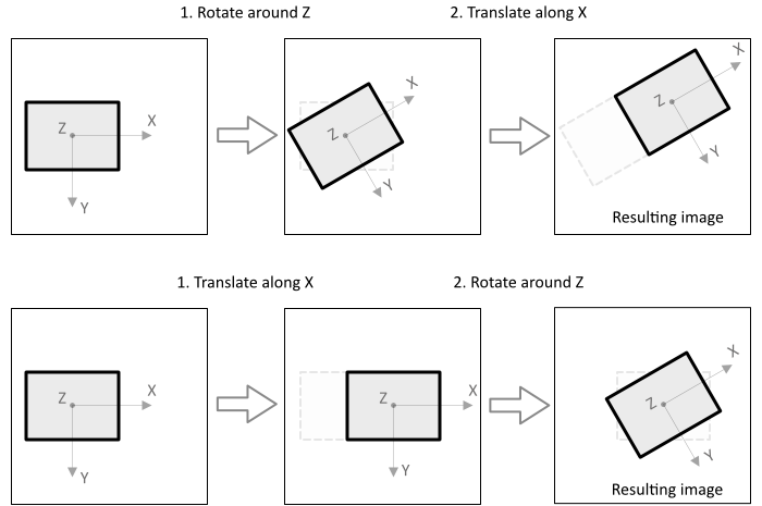 Imagine, you intend to combine the translation along the X-axis with the rotation around the Z-axis. You have thus two possibilities: you can rotate first and then translate, or you translate first and then rotate. Depending on this order, you will get completely different results: