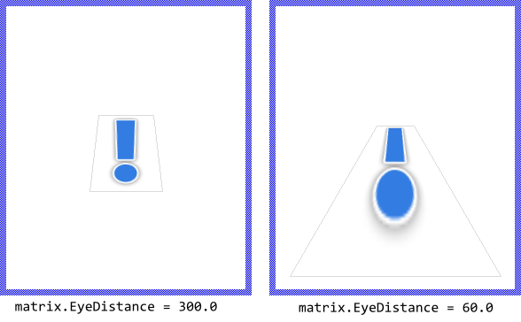 Please note, the matrix property EyeDistance is per default initialized with the value 0. You should therefore always initialize it with a correct value when you intend to perform a 3D transformation. If you are not sure which value is appropriate, you can try several values starting with a large one, at least greater than the width and height of the original image to display in the view.