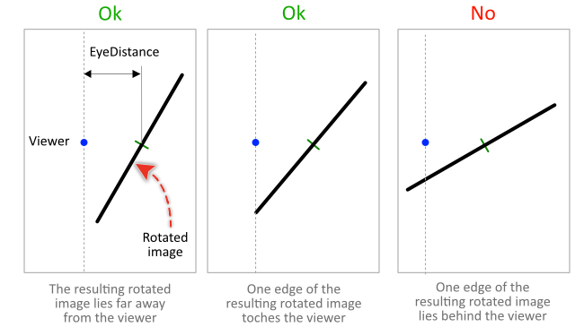 Please note the restriction of the Warp Group view expecting the image, after being 3D transformed, to lie completely in front of the specified viewer. For example, when you rotate a large image around its X- or Y-axis, the image edges may reach or even pass over the position of the viewer. If parts of the projected image lie behind the viewer, the Warp Group view is not able to perform the projection and remains empty. The following figure demonstrates in a side view the described rotation situation: