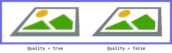 The usage of the bilinear filter is controlled by the property Quality. Per default the filter is enabled. By initializing Quality with the value false you can deactivate it again. The following figure demonstrates the results depending on the current setting of the property: