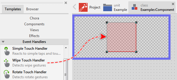 To add a new Wipe Touch Handler object just at the design time of a GUI component do following:
